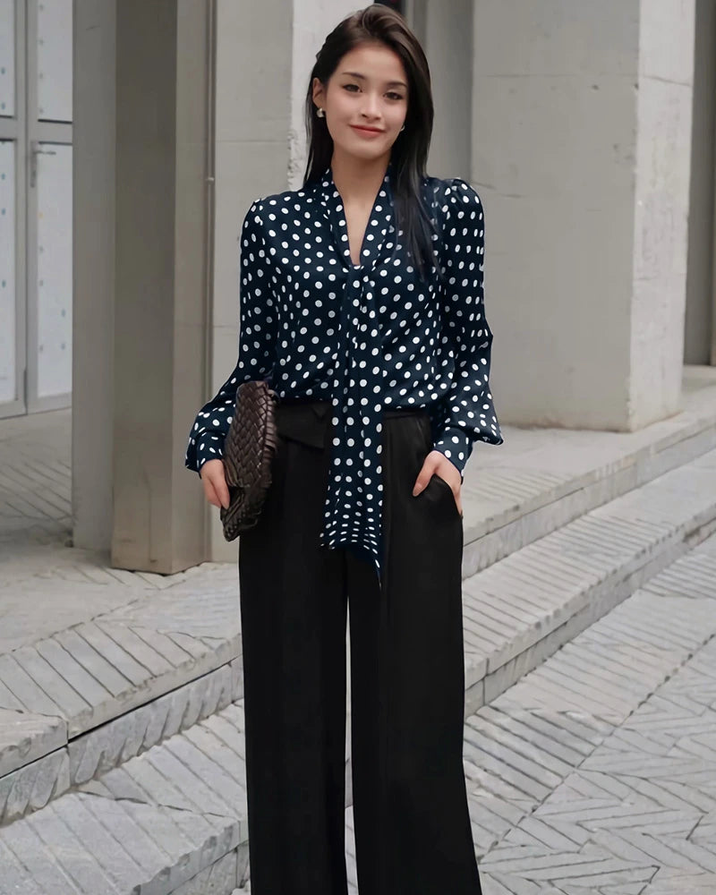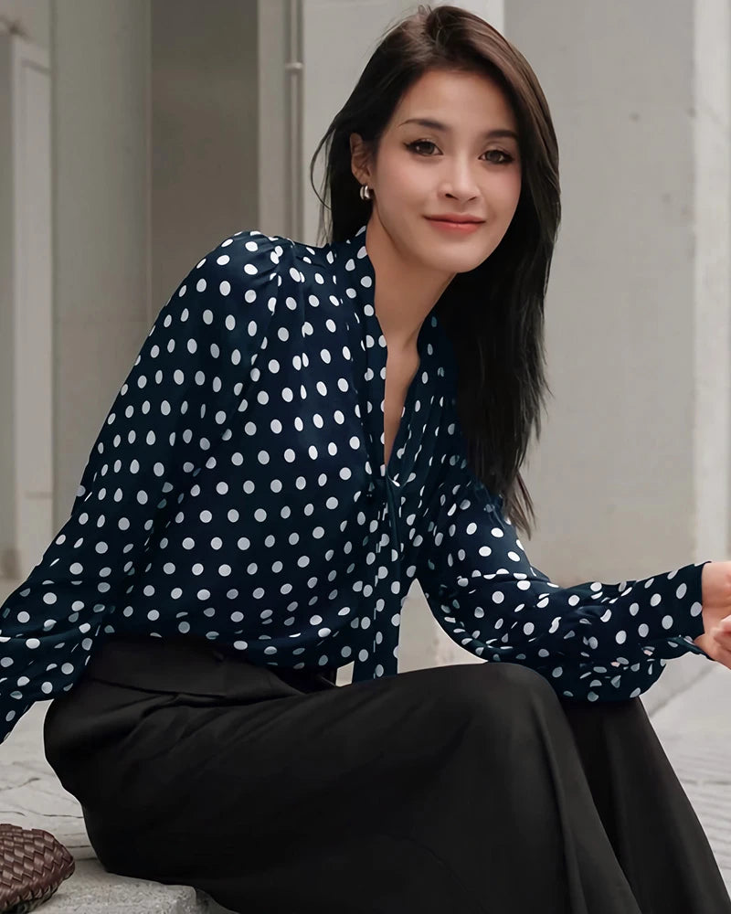 A delicate silk tie front top with a soft front tie silk blouse silhouette, this shirt features a flattering v-neck and flowing long sleeves. The timeless black and white polka dot print adds playful sophistication. Whether you're searching for a polka dot silk shirt, silk polka dot blouse, or a silk long sleeve shirt women's style, this piece checks all the boxes.