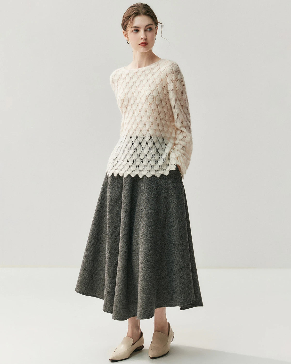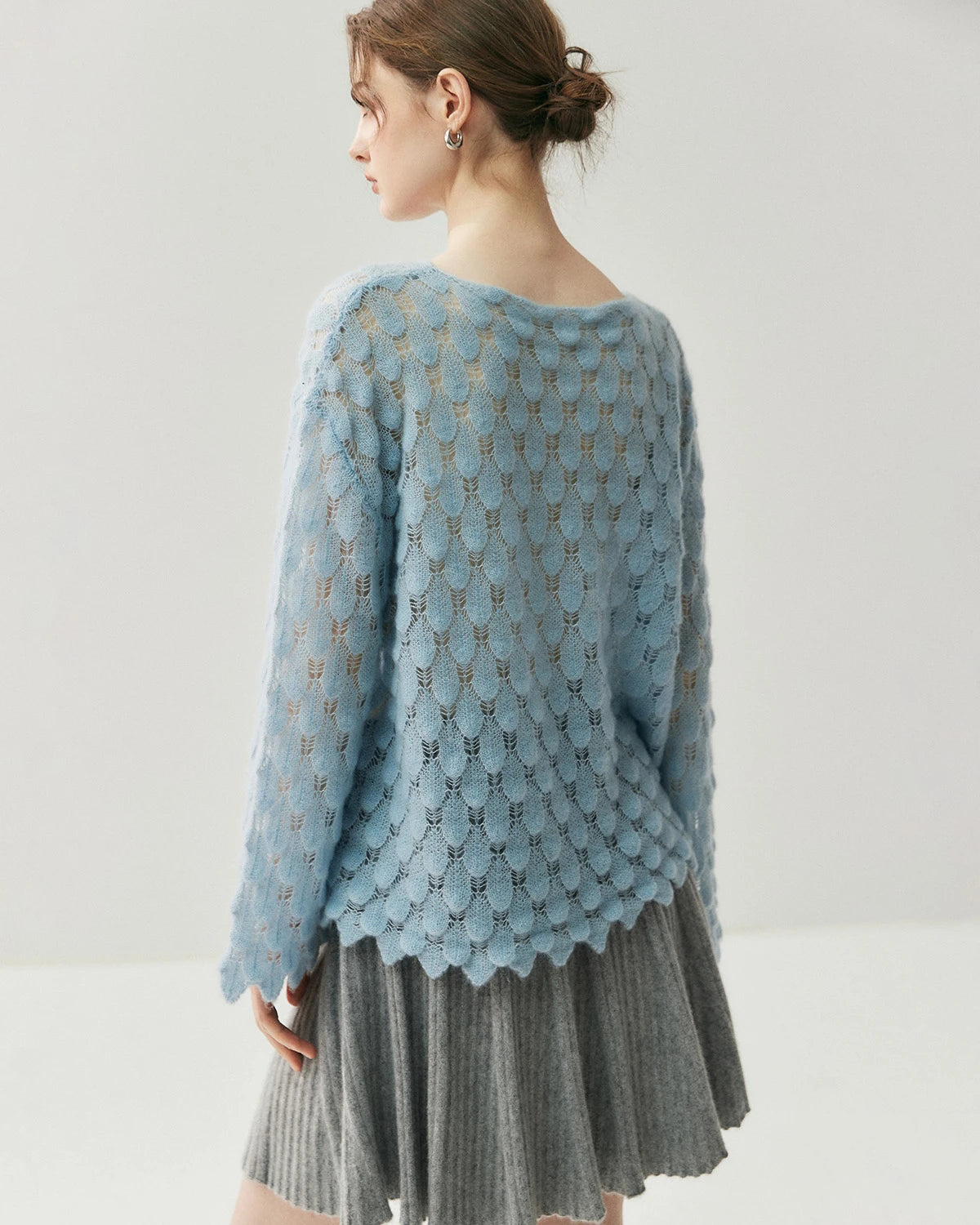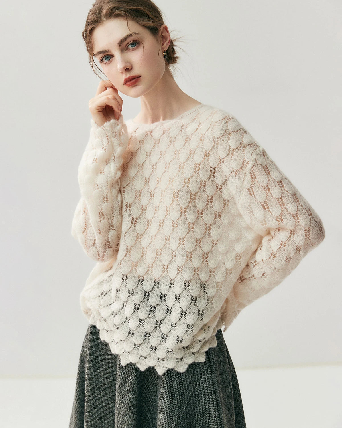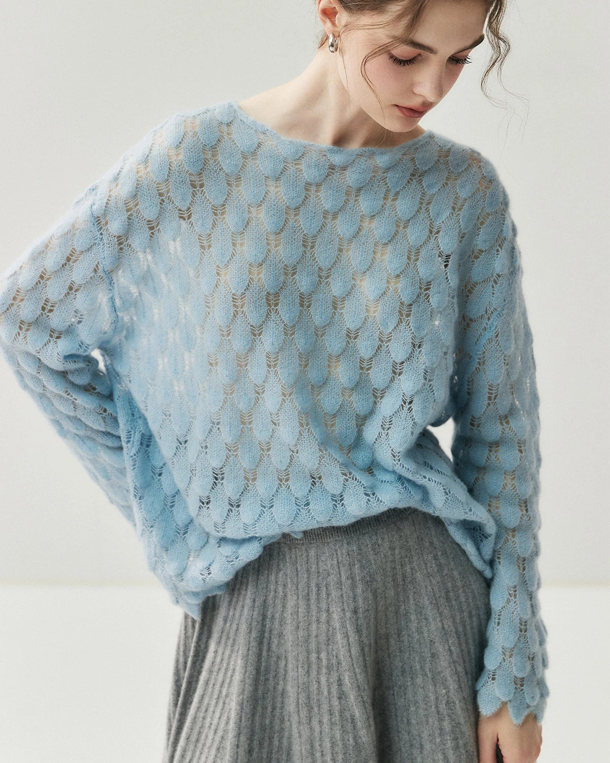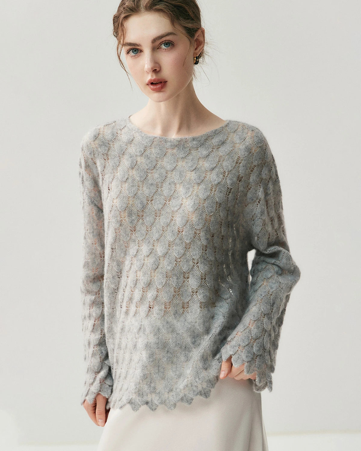 This crew neck pullover features flared sleeves and a delicate openwork cable knit pattern. Designed as a lightweight cashmere pullover sweater, it delivers refined style with a relaxed fit. The fine knit texture enhances its breathable nature, making it a perfect addition to womens cashmere wardrobes seeking effortless elegance.