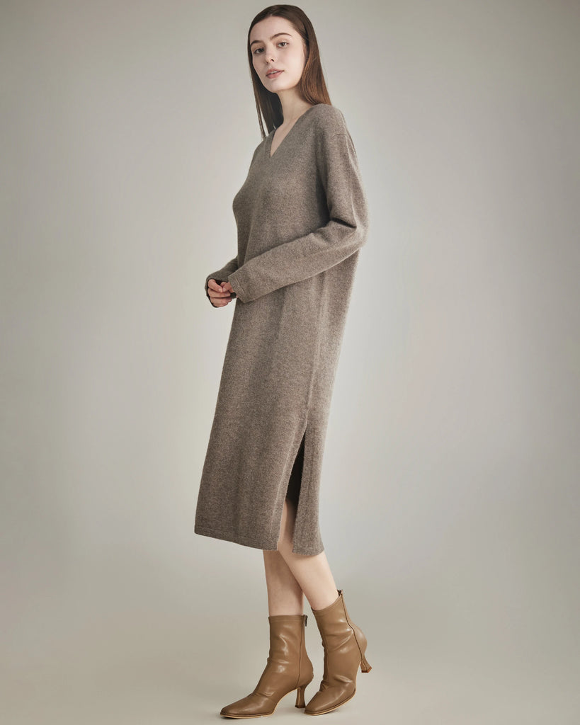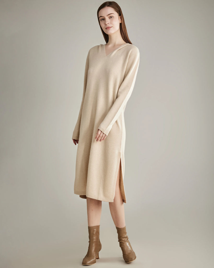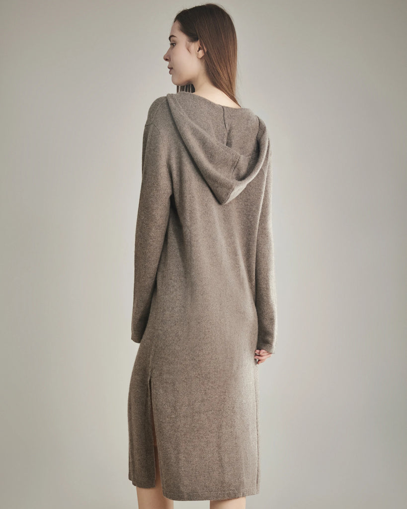 Experience the ultimate comfort and elegance with this women's hooded cashmere knit dress. Made from soft, premium cashmere, it features a relaxed fit, a cozy hood, and chic side slits for ease of movement. The mid-length design adds a touch of sophistication, perfect for casual days or layering during cooler seasons. Whether you're lounging at home or heading out, this versatile dress brings both style and warmth.