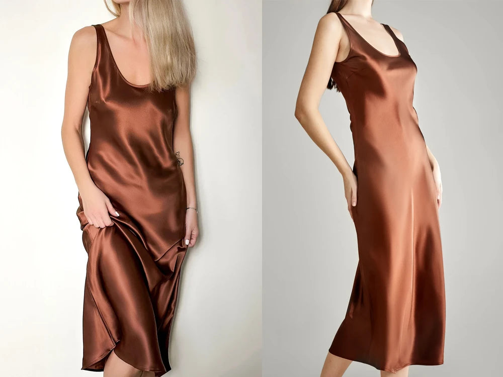 Tied together with delicate straps, the open-back detail not only provides a subtle allure but also allows for a customized and adjustable fit. The smooth and lustrous silk fabric drapes gracefully, creating a flattering silhouette that complements various body shapes.
