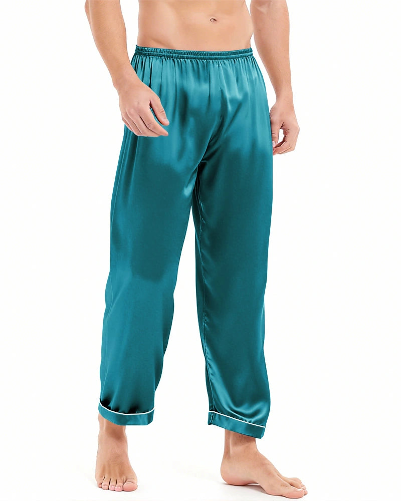 These men’s silk pajama pants are crafted from premium mulberry silk, offering a smooth, breathable feel that makes them ideal for sleep and everyday lounging. The long, relaxed silhouette delivers effortless comfort, while the contrast piping at the leg hem adds a subtle, refined touch to the classic design.