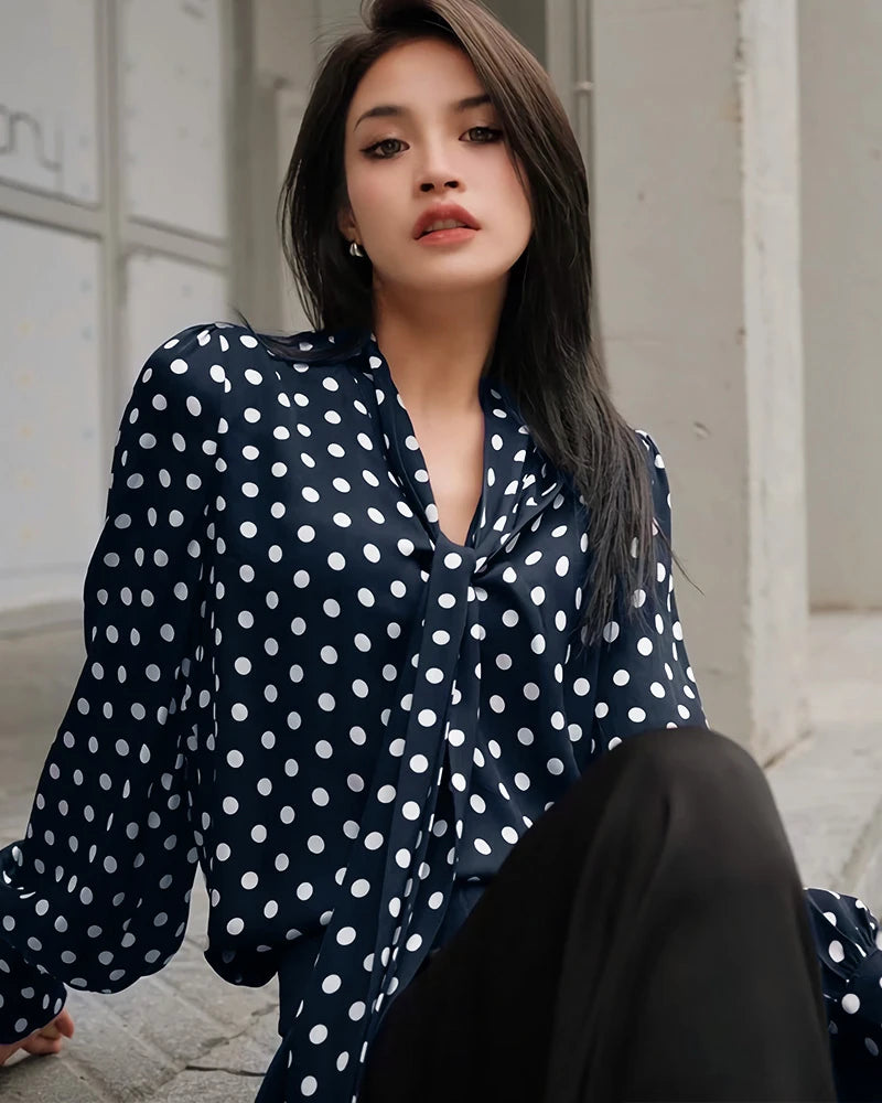 A delicate silk tie front top with a soft front tie silk blouse silhouette, this shirt features a flattering v-neck and flowing long sleeves. The timeless black and white polka dot print adds playful sophistication. Whether you're searching for a polka dot silk shirt, silk polka dot blouse, or a silk long sleeve shirt women's style, this piece checks all the boxes.