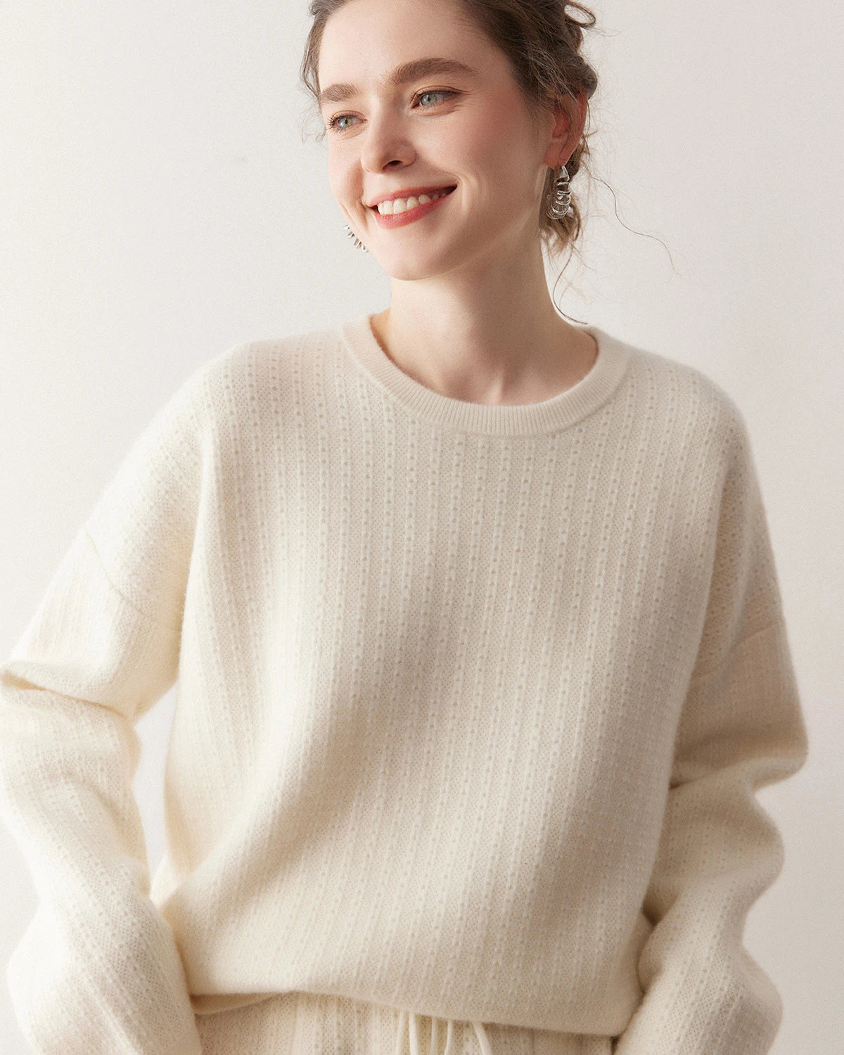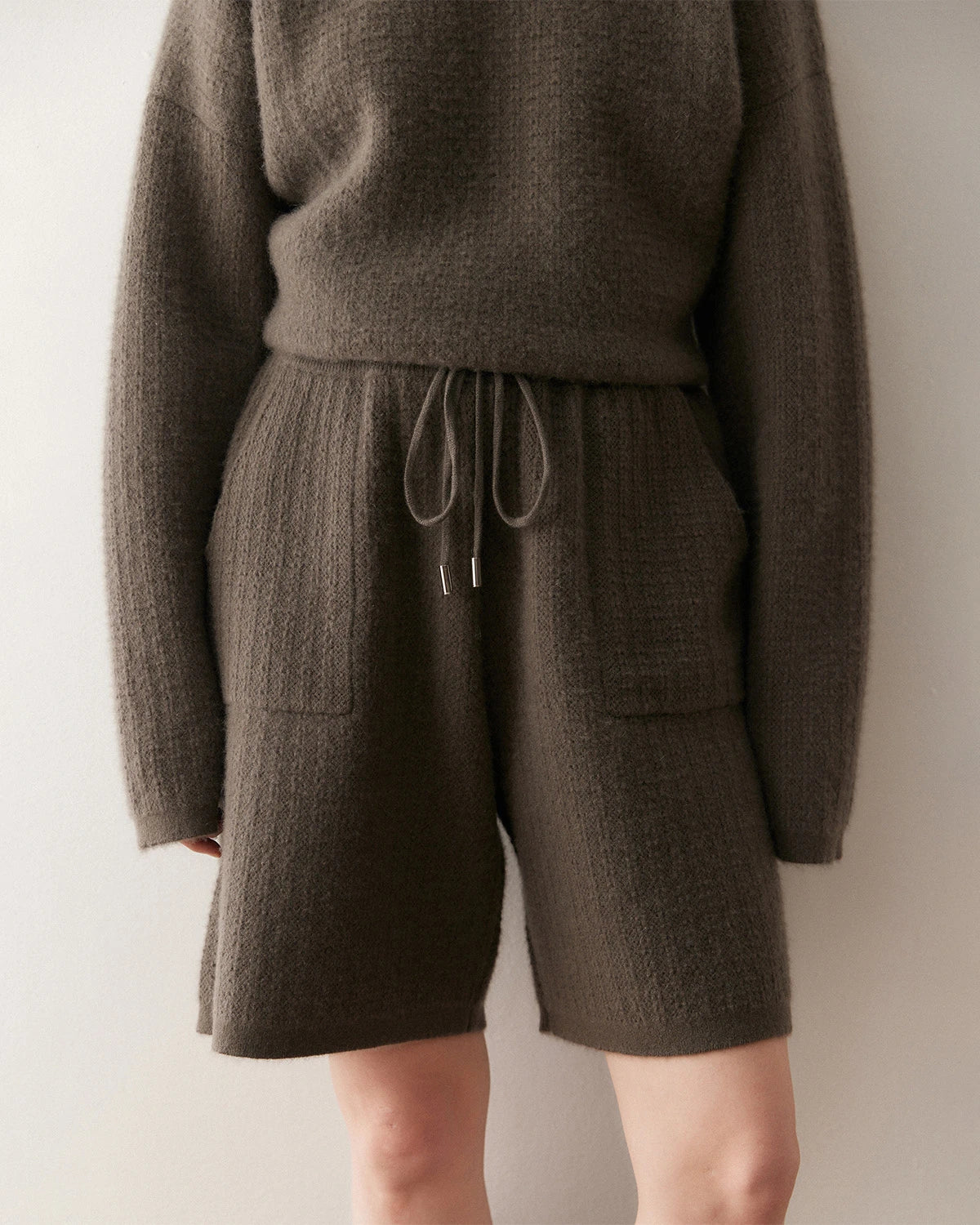 This cashmere sweater set features a relaxed dropped-shoulder pullover and wide-leg knit shorts for effortless comfort and versatility. The loose-fit top adds a modern, laid-back silhouette, while the drawstring waist on the shorts ensures a personalized fit. The subtle texture of the woolen shorts balances casual charm with refined craftsmanship. Whether you choose classic neutrals or white knit shorts, this set embodies easy elegance and timeless appeal—perfect as a cashmere set for women or a cozy knit shorts outfit for daily wear.