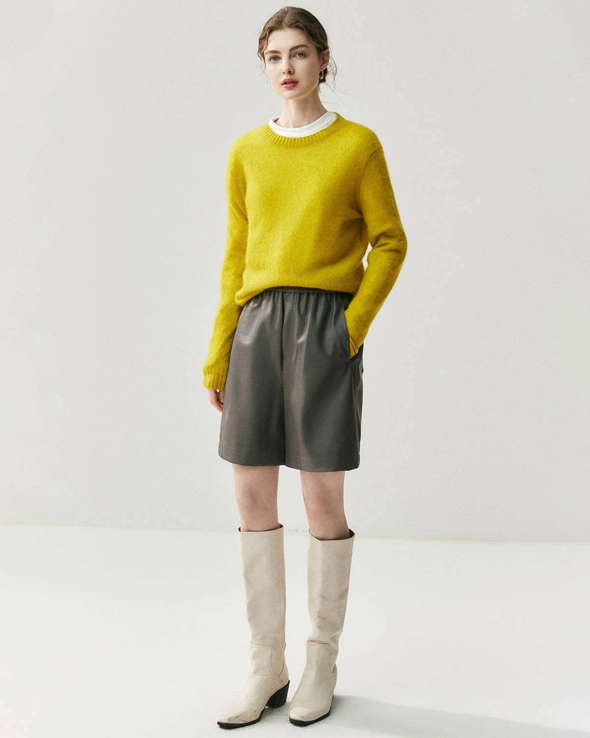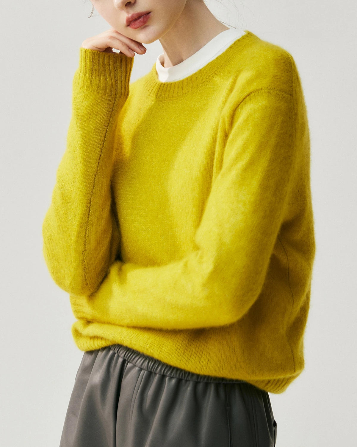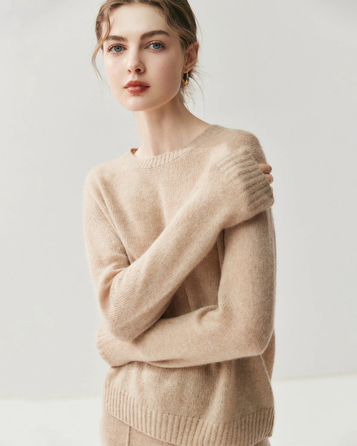 This minimalist crew neck pullover features a clean plain-knit structure with a modern slim-relaxed fit. Designed for effortless layering, it represents timeless women’s cashmere jumper style and cashmere pullover women fashion, offering understated elegance for every wardrobe.