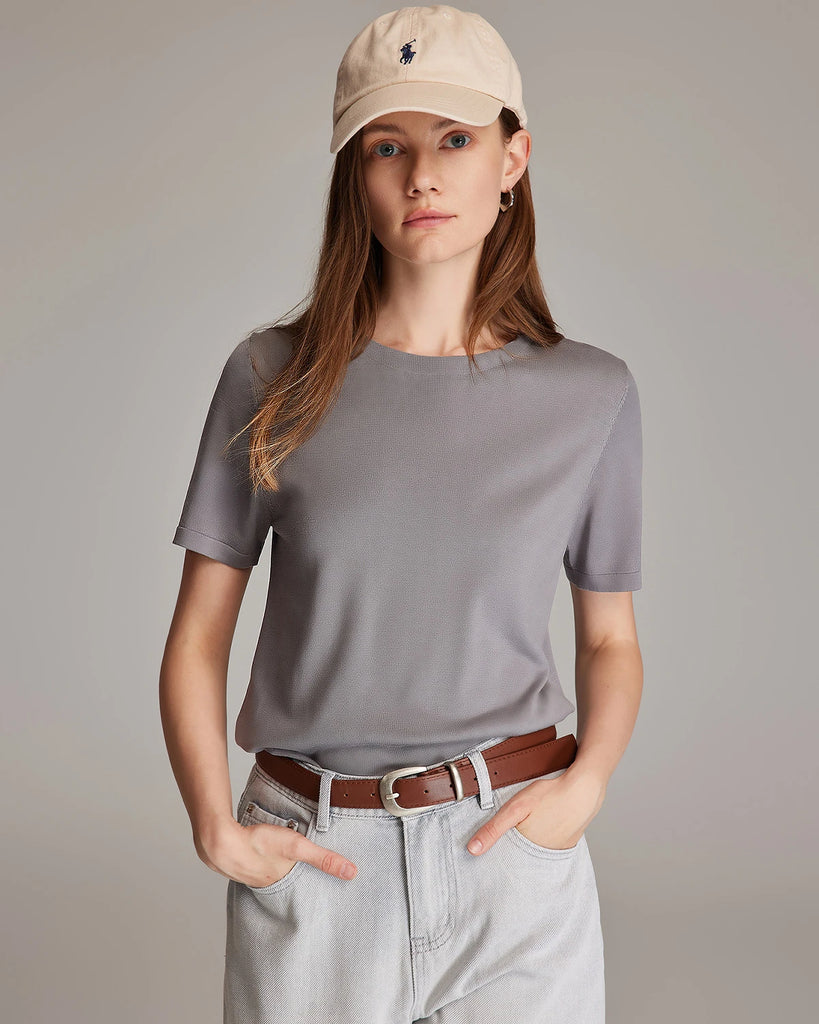 This women's short sleeve tee features a relaxed silhouette, round neckline, and clean hemline for a timeless look. Designed as a versatile staple, the silk knit shirt comes in both black and white options to pair effortlessly with jeans, trousers, or skirts. For those looking for ladies short sleeve t shirts or short sleeve white shirt women's styles, this tee fits effortlessly into any wardrobe.